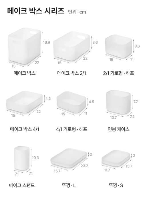 | 메이크 박스 2/1 | 22 × 15 × 8.6 cm | 2호 : 22 × 15 × 8.5 cm | 동일 |